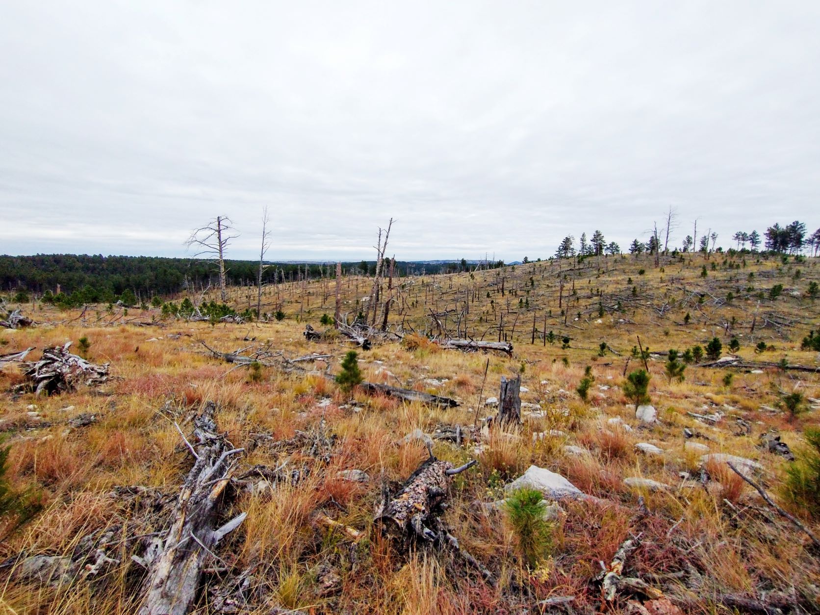 For the next 2 days, we hiked south 28.5 miles through the entire Custer State Park. The days were sunny and in the 50s, while the nights were frosty 30s, almost perfect hiking weather. There were lots of ups and downs, some harder than others, nothing as hard as the Colorado Trail or the Appalachian Trail, but challenging nonetheless. We hiked through large stands of golden aspen trees fluttering on the breeze and huge areas of pine decimated by recent storms. We encountered the stray bison bulls, prairie dogs, praying mantis hunting grasshoppers, and even a small group of Pronghorns, which is the second-fastest land animal in the world. Overnight, packs of coyote yelped and howled intermittently as they hunted the forest all around us.